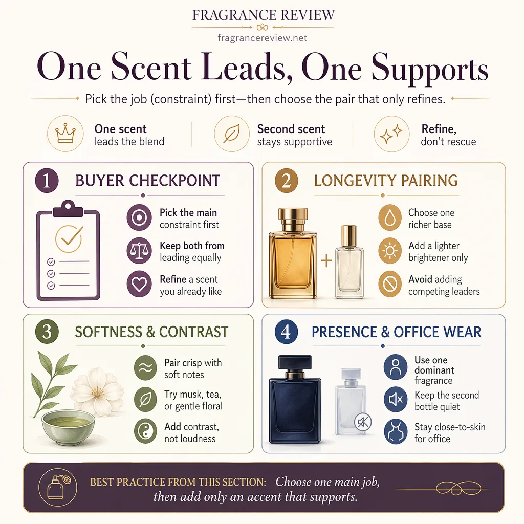 Pick the job before you pick the pair. Layering for longevity uses one richer base and one lighter accent. Layering for personality uses one familiar bottle and one note that adds contrast, like brightness over warmth or softness over spice.